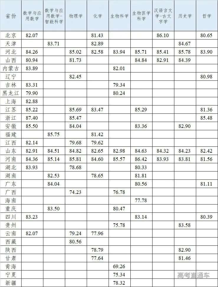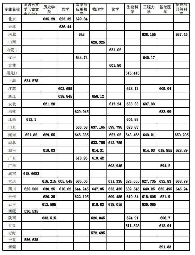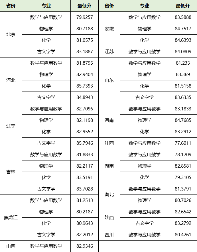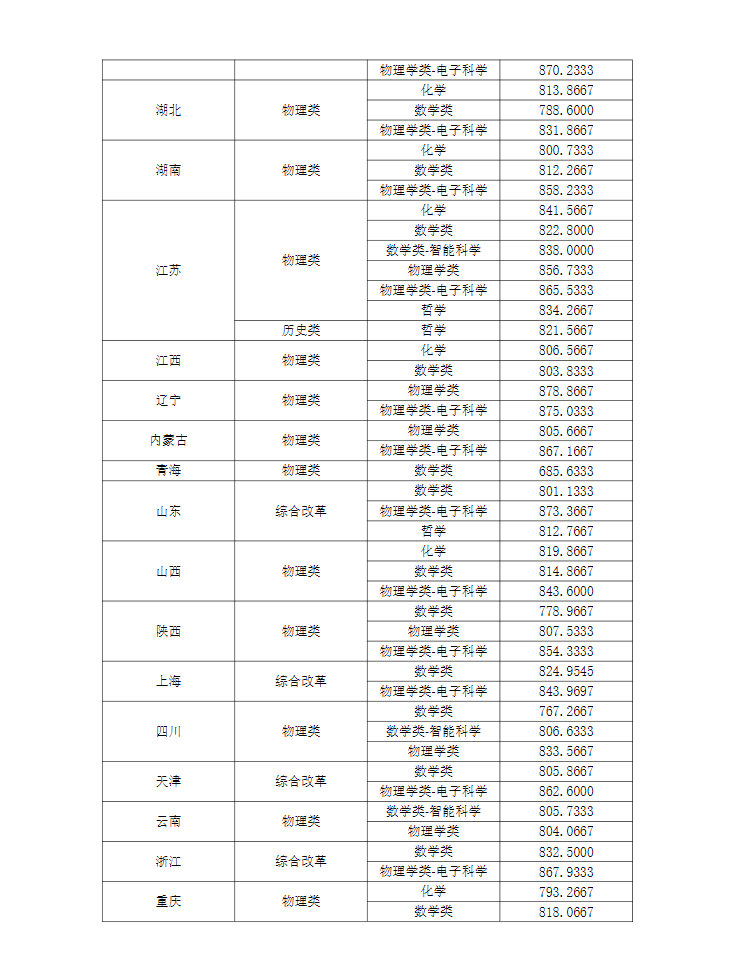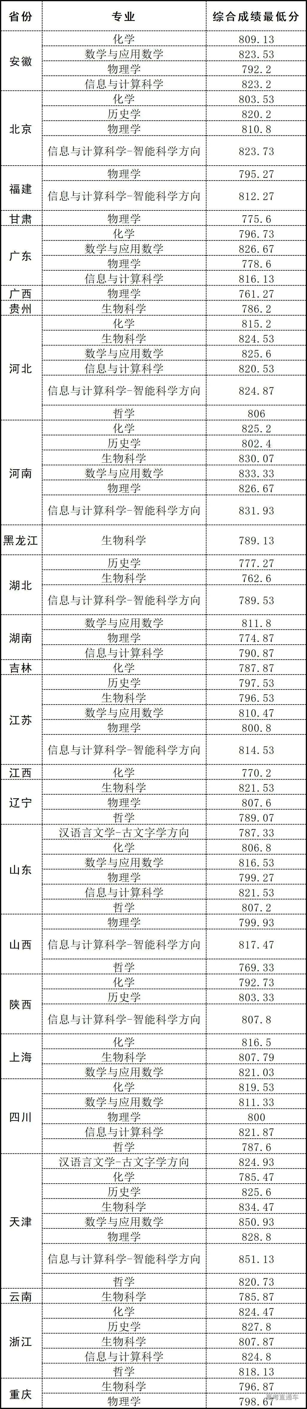 根据《中国科学技术大学2025年强基计划招生简章》相关规定,现将中国科学技术大学2025年强基计划(第一类考生)招生专业在相关省(自治区、直辖市)录取*低综合*公示如下: