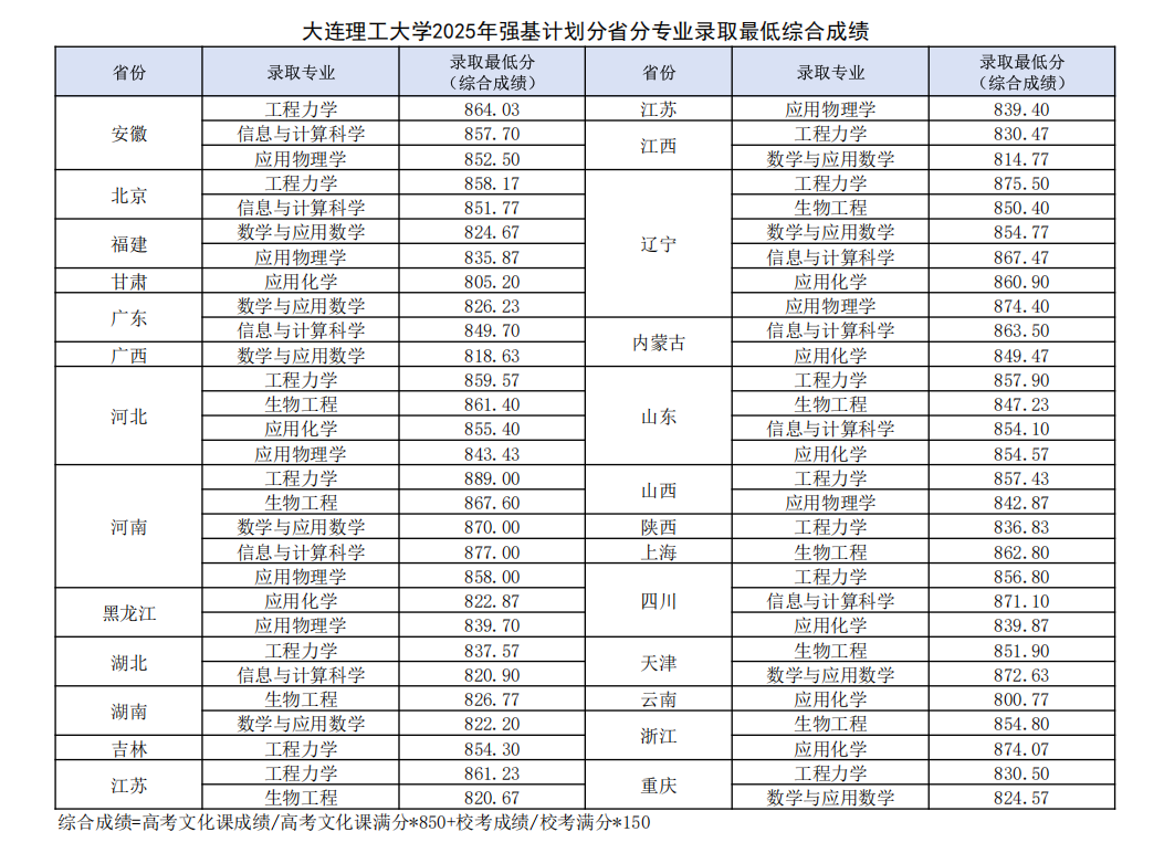 根据教育部《关于在部分高校开展基础招生改革试点工作的意见》(教学〔2020〕1号)等文件要求,按照《大连理工大学2025年强基计划招生简章》有关规定,通过组织专家面试,经学校研究同意,现发布我校2025年强基计划分省分专业录取*低综合*。