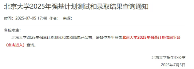 北京大学2025年强基计划测试和录取结果已公布,考生可登录北京大学2025年强基计划信息平台查询。