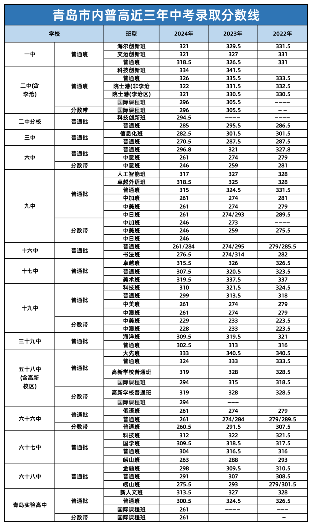 2025年的中考*查询下周开始,给大家总结了青岛市内各高中近三年的普通批(不含自招)录取分数线,供大家参考~大家觉得今年数线是会比去年高还是低呢?