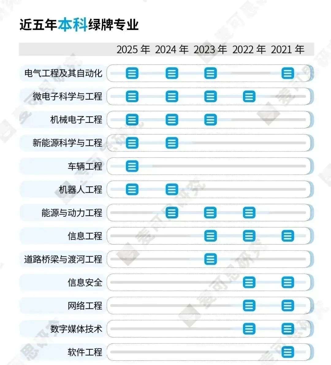 2025年本科绿牌专业全部为工科,包括电气工程及其自动化、微电子科学与工程、机械电子工程、新能源科学与工程、车辆工程、机器人工程等专业。