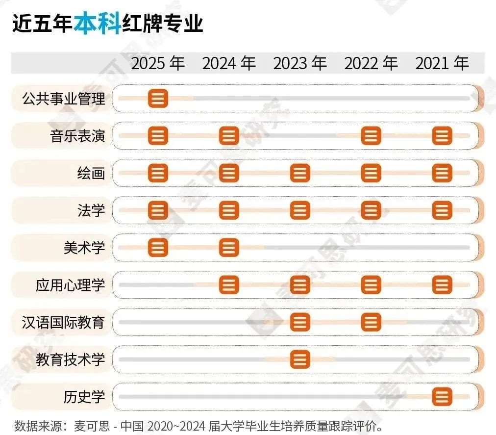 2025年本科就业红牌专业包括:公共事业管理、音乐表演、绘画、法学、美术学。