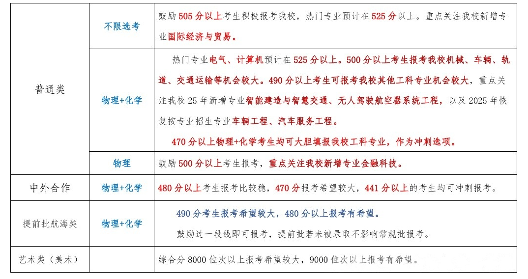 位次为20万名(分数为495分)左右及以上考生,可以选择冲一下我校普通本科,其中建议选考“物理+化学”或“物理”的考生,优先选择理工科限考物理+化学”或“物理”的专业,位次越靠前,冲击希望越大,建议位次为17万名(分数为507分)左右及以上考生,可选择我校“不提选考科目”的专业,位次越靠前,冲击希望越大。中外合作:位次为19万名(分数为499分)左右及以上考生,可以选择冲一下我校中外合作类本科专业,位次越靠前录取希望越大。