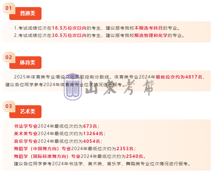 2025年普通类一段线441分。按选考科目要求划分(依据山东省招生考试院公布的总位次)思想政治教育(师范类)(选考科目:思想)以上考生鼓励报考;14万位次(521分)以上考生鼓励冲一冲;地理科学(师范类)(选考科目:地理)13万5千位次(523分)以上考生鼓励报考;14万7千位次(517万家分)以上考生鼓励冲一冲:理工类专业(选考科目为物理化学双选)31万位次(451分)以上考生鼓励报考;32万位次(447分)以上考生鼓励冲一冲;