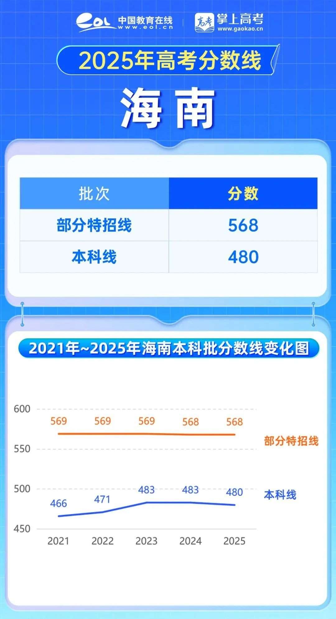 2025年海南高考分数线变化较小,部分特招线568分,与去年持平;本科线480分,下降3分