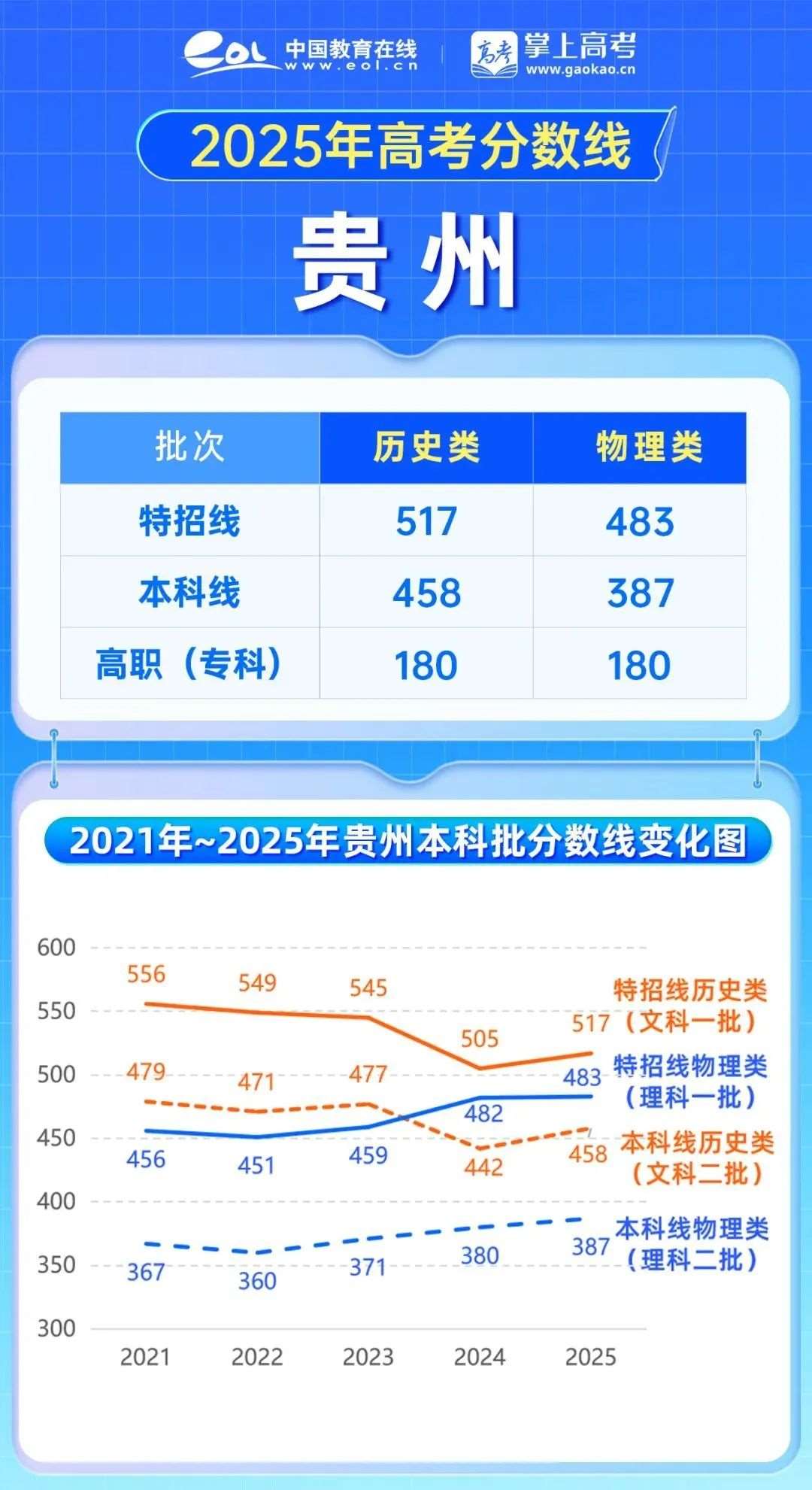 整体来看,贵州2025年分数线较2024年相比上涨特招线,;本科线历史类上涨16分,物理类上涨7分