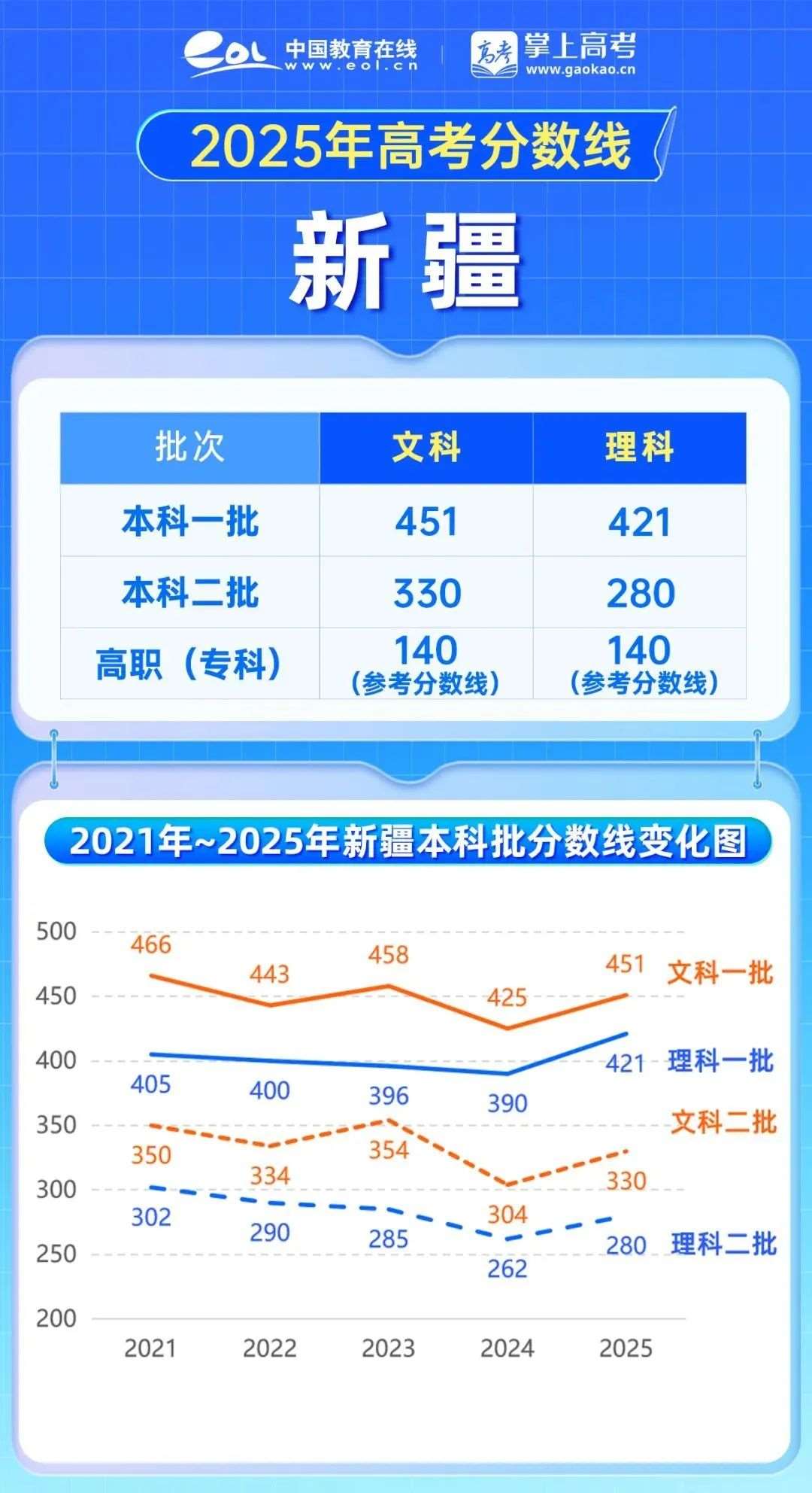 2025年新疆高考分数较2024年呈上涨趋势,文科一批451分,较去年上涨26分,文科二批330,较去年上涨26分,理科一批421分,较去年上涨31分,理科二批280分,较去年上涨18分