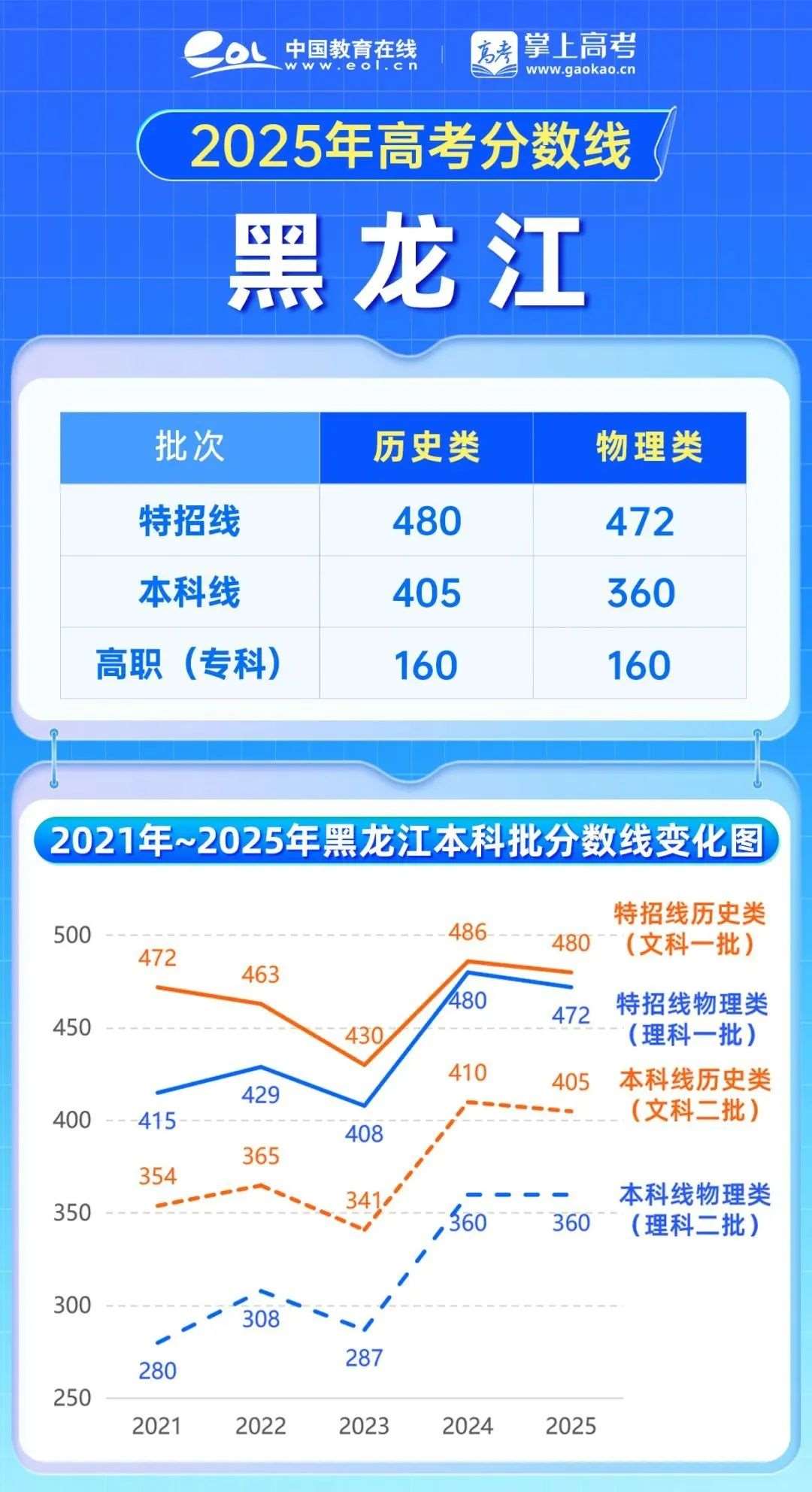 2025年黑龙江高考历史类分数线下降,特招线历史类480分,下降6分,本科线405分,下降5分;,下降8分,本科线与去年持平