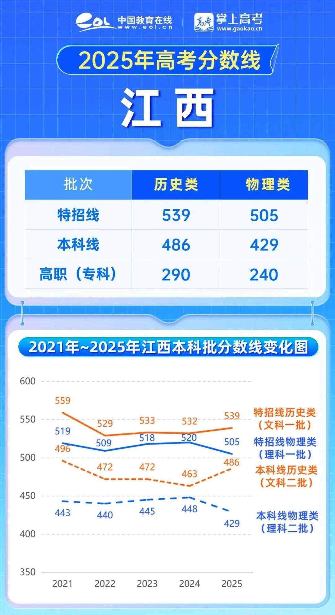 2025江西高考数线上涨,特招线历史类539分,上涨7分,本科线486分,上涨23分;数线下降,特招线505分,下降15分,本科线429分,下降19分