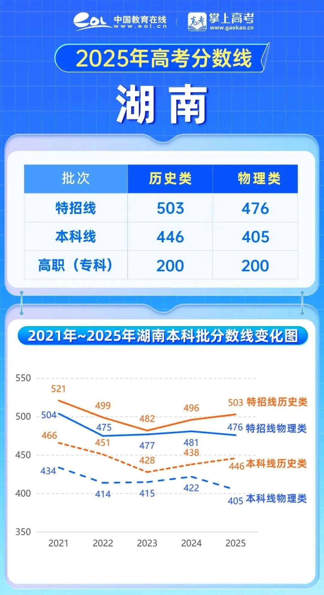 2025年本科批分数线中,湖南历史类普遍上涨:特招线,上涨7分,本科线,上涨8分物理类分数线下降,特招线476分,下降5分,本科线405分,下降17分
