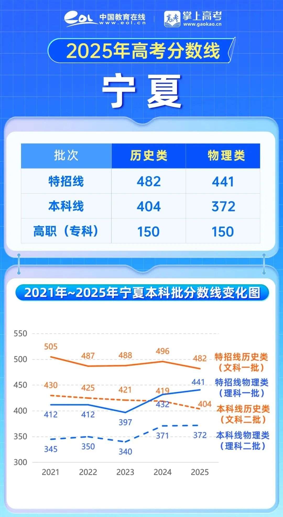2025年宁夏高考数线下降,特招线,下降14分,本科线404分,下降15分;数线上涨,特招线,上涨9分,本科线372分,上涨1分