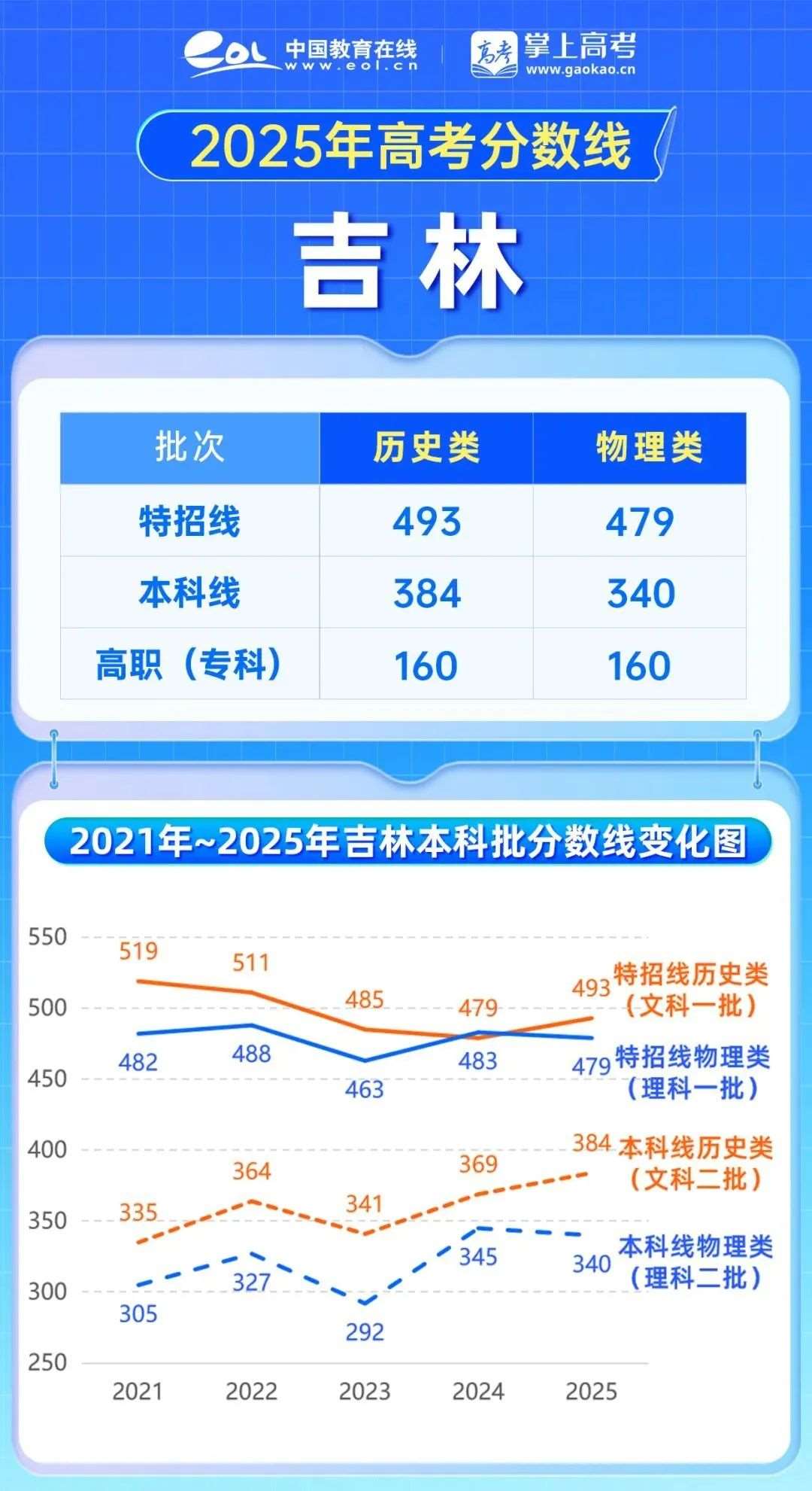 2025年吉林高考数线上涨,特招线历史类493分,上涨14分,本科线384分,上涨15分;数线下降,特招线479分,下降4分,本科线340分,下降5分