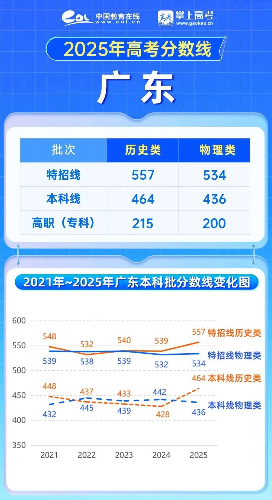 2025年广东高考数线大幅上涨,特招线历史类557分,上涨18分,本科线464分,上涨36分;特招线物理类534分,上涨2分,本科线436分,下降6分
