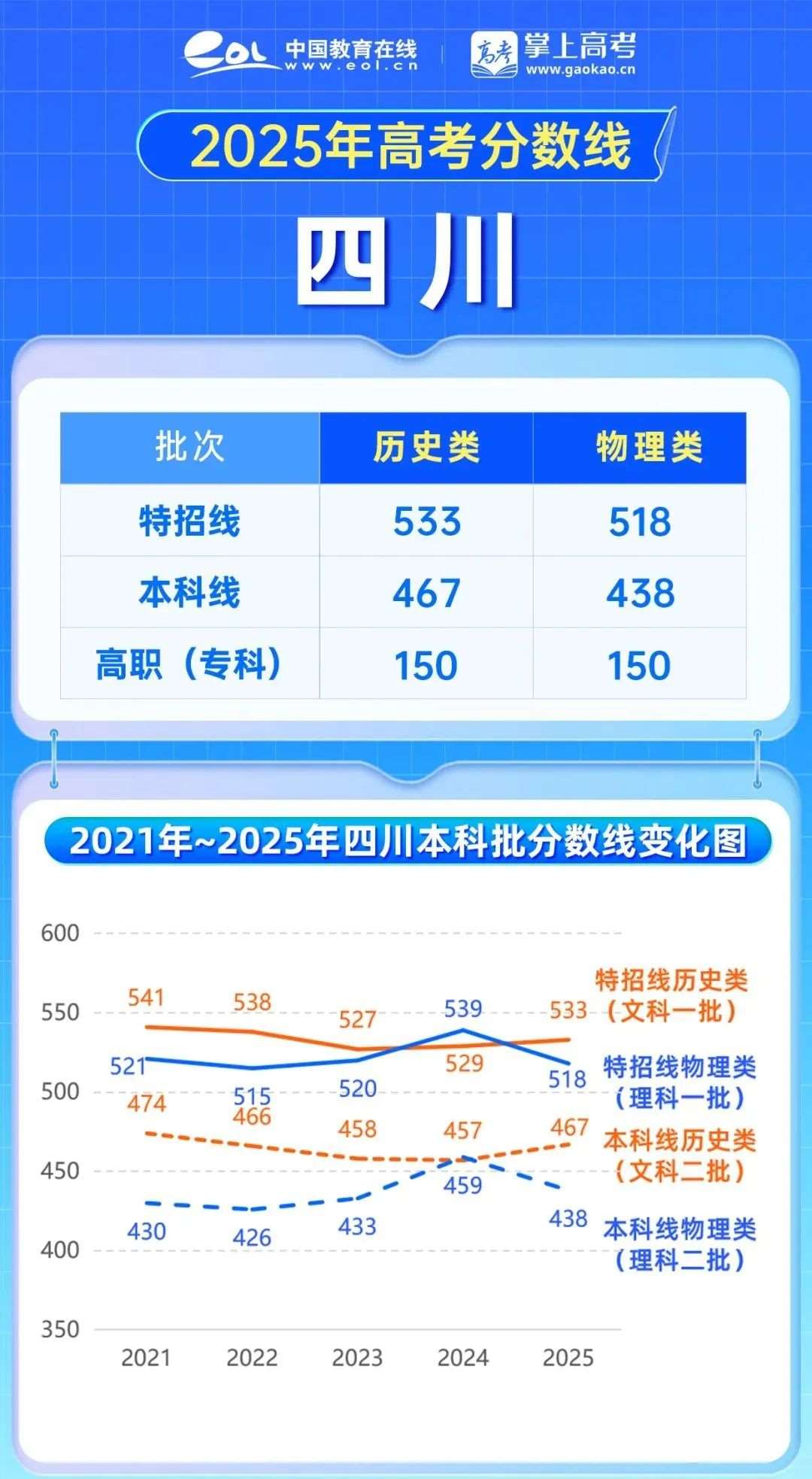 2025年四川高考数线上涨,特招线,上涨4分,本科线467分,上涨10;数线下降,特招线,下降21分,本科线438分,下降21