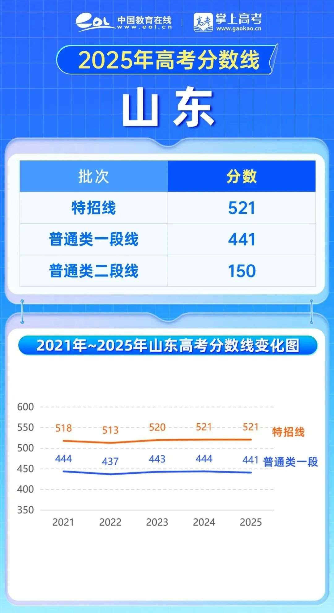 2025年山东高考特招线521分,与去年持平;普通类一段441分,与去年相比下降3分。