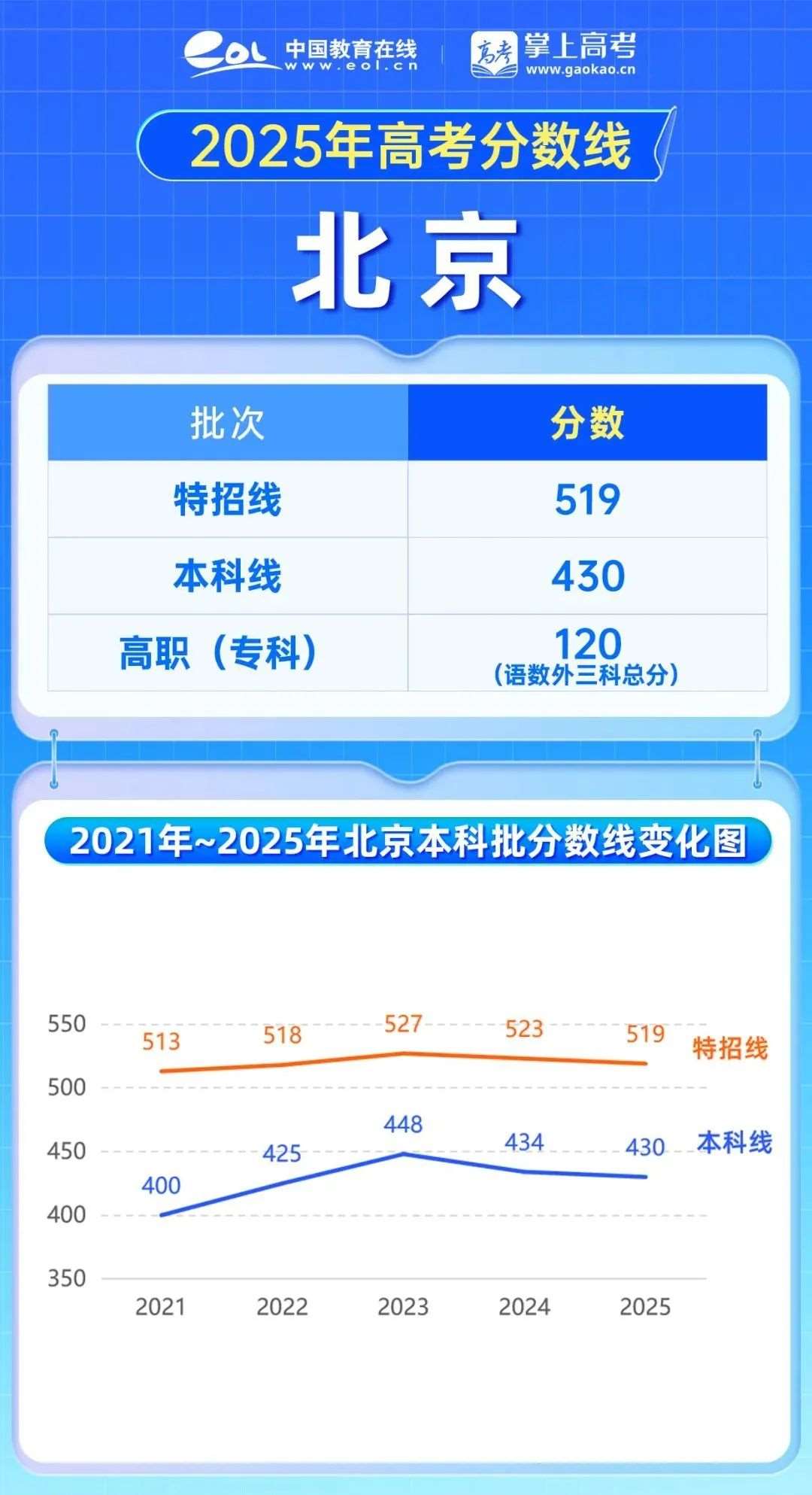 2025年北京高考分数线变化较小,特招线519分,下降4分,本科线430分,下降4分
