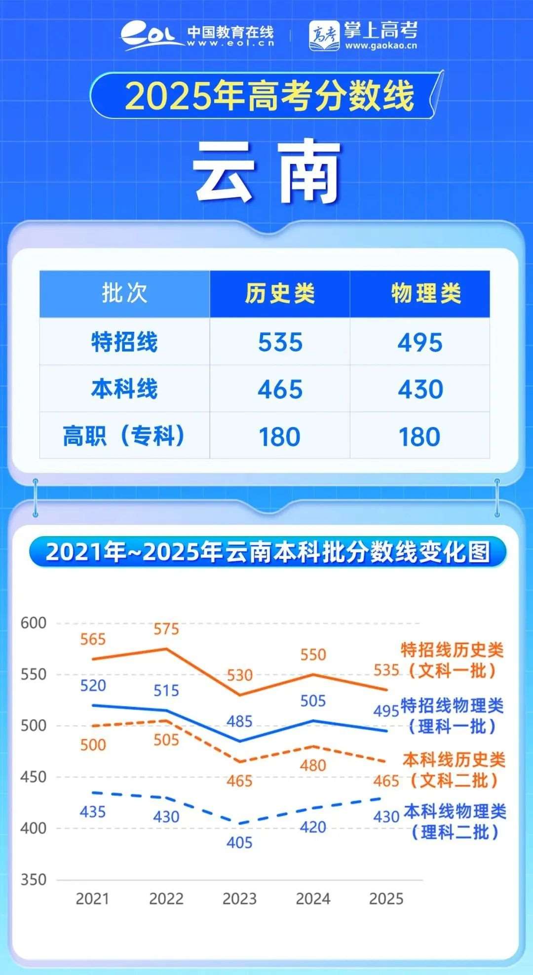 本科线之外,云南2025年本科批分数线较2024年均下降。特招线,,本科线