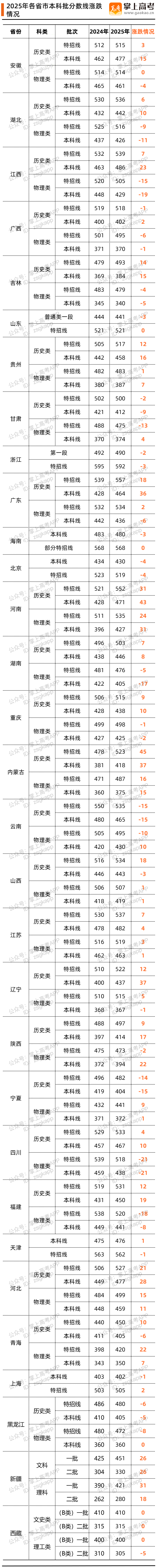 整体来看,河北2025年本科批分数线较2024年相比均有所提升。特招线、;本科线,