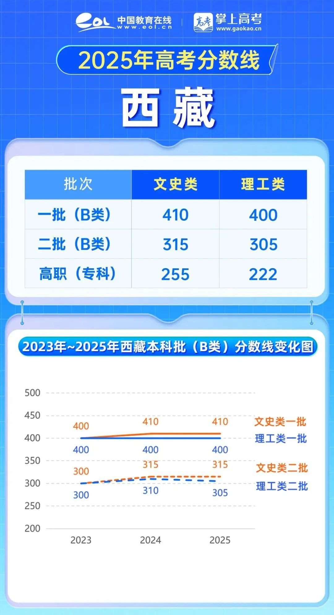 2025年西藏高考分数较2024年分数变动较小,文史类本科一批B类、文史类本科二批B类、理工类本科一批B类考生分数线与去年持平理工类本科二批B类考生分数线下降5分