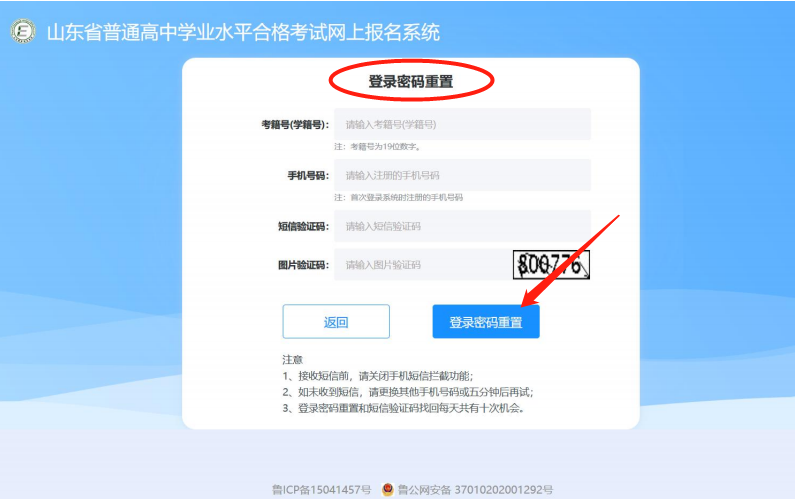 在登陆页面中点击【登录密码重置】后,在跳转页面中,依次输入考籍号(学籍号)、常用手机号码、短信验证码、图片验证码,确认填写无误后,点击【登陆密码重置】,如下图所示: