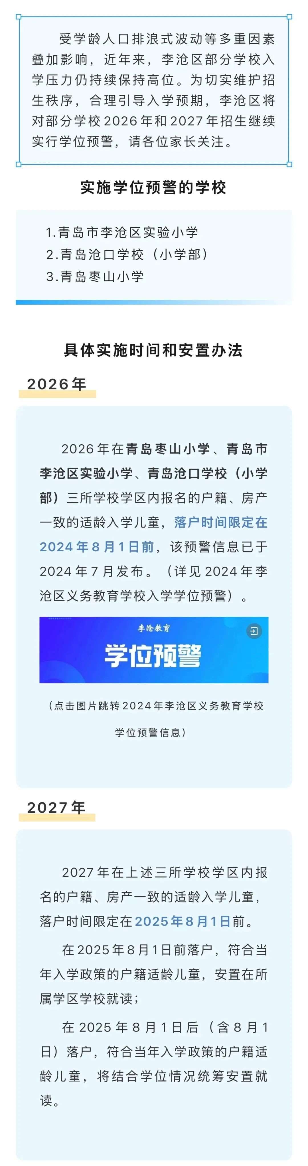2026年学位预警学校3所无变化,新增3所小学(青岛枣山小学、青岛市李沧区实验小学、青岛沧口学校(小学部))2027年学位预警。