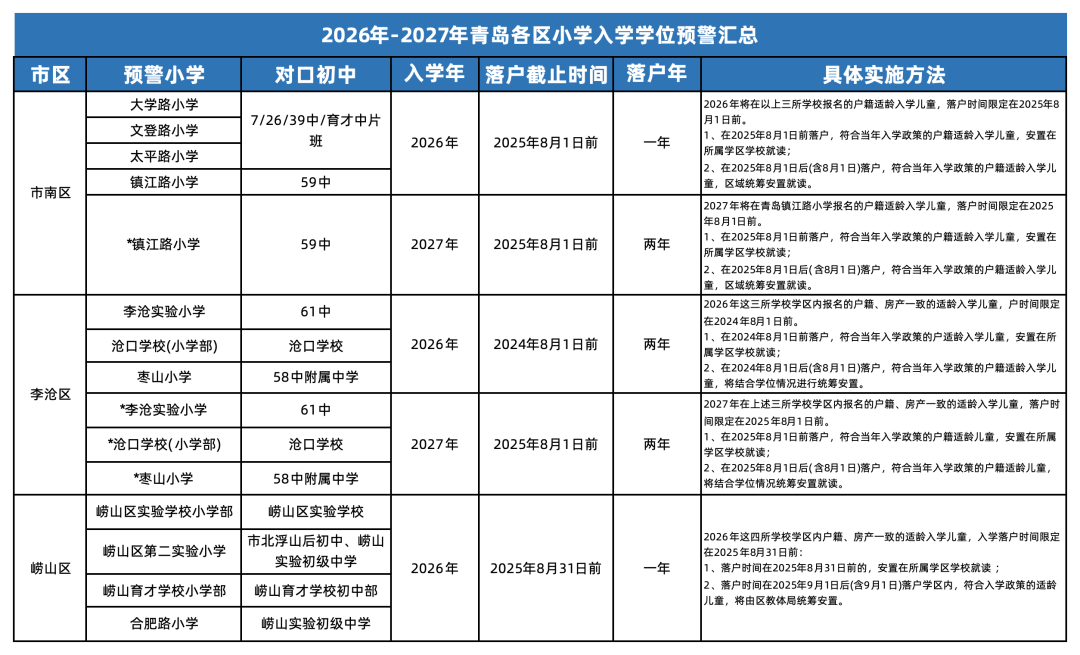 ⭐目前李沧区、市南区发布2026、2027年学位预警小学,崂山区之前公示过2026年的,有无改变暂未可知,市北区暂未公示。