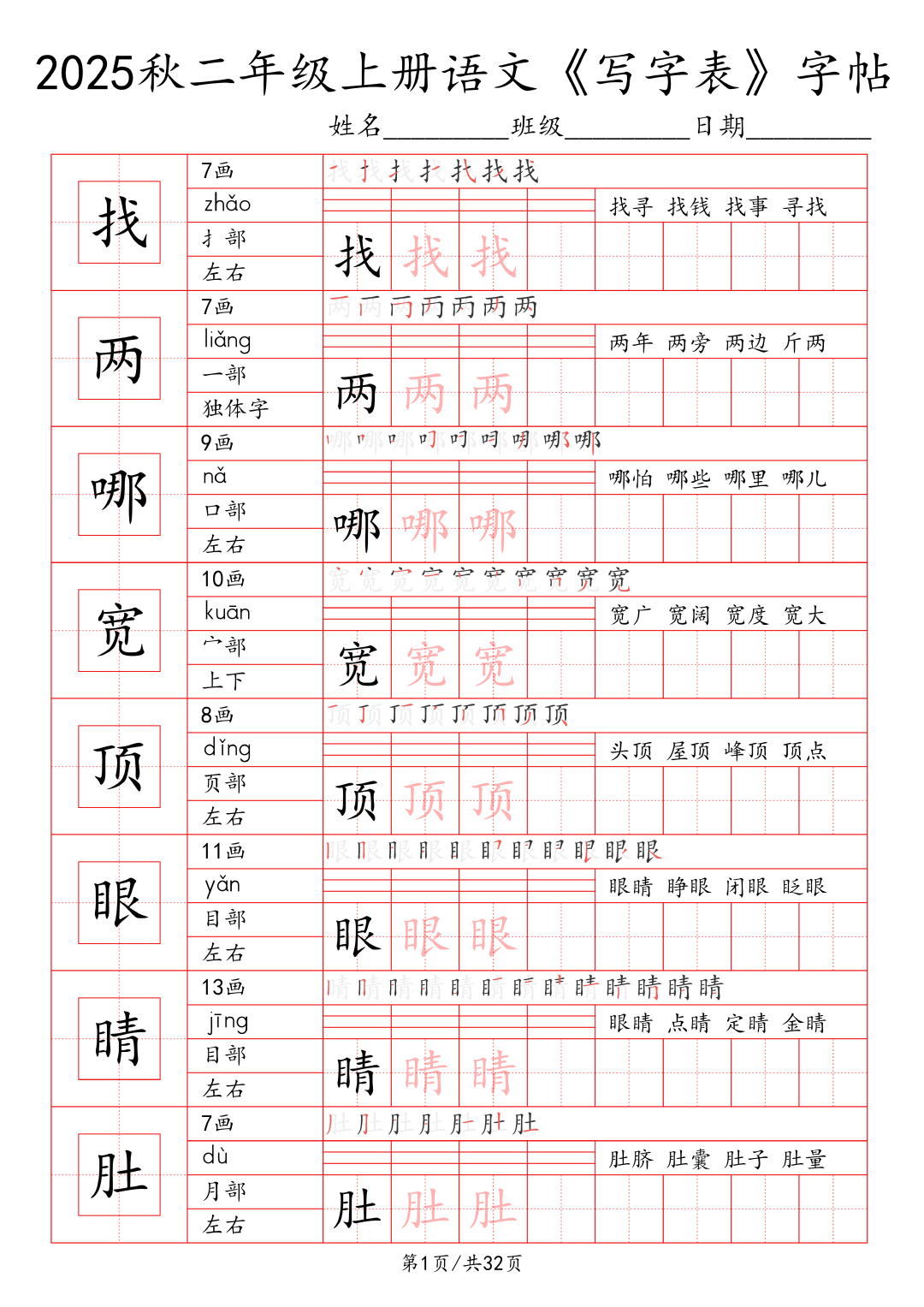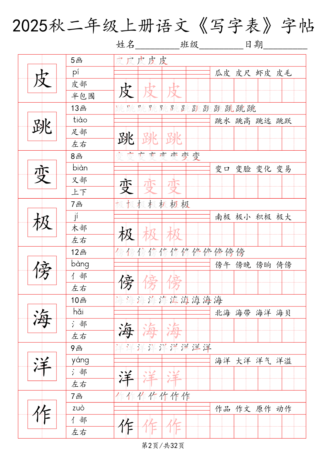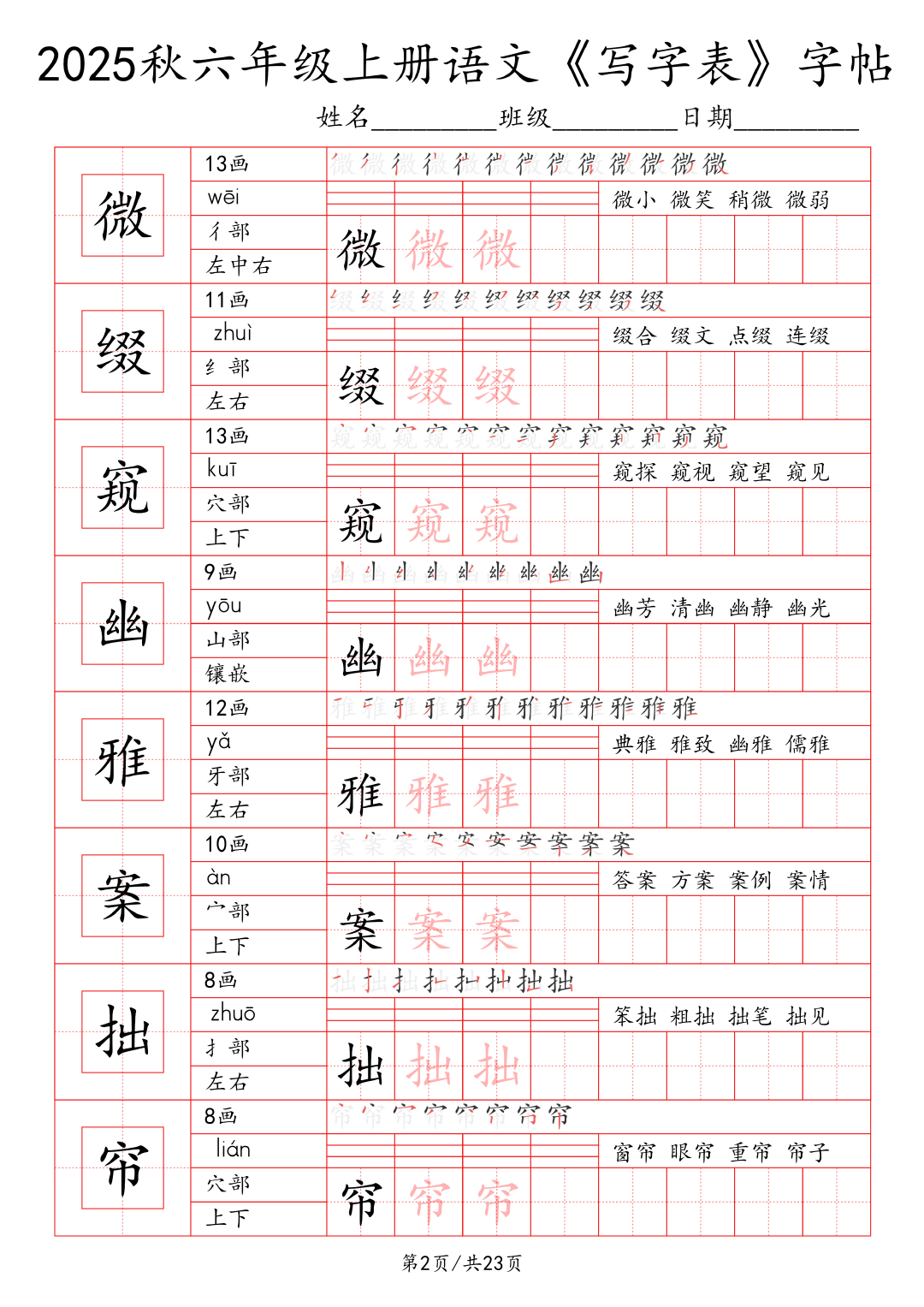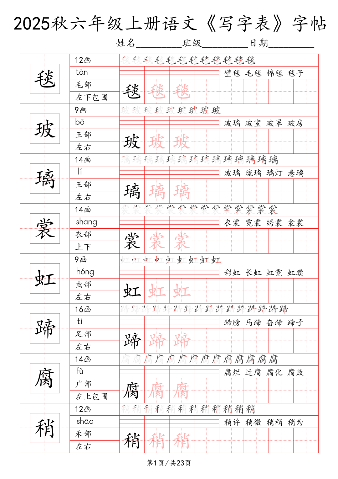 25年秋季学期最新版小学1~6年级语文写字表字帖!