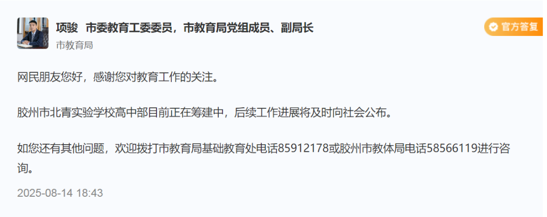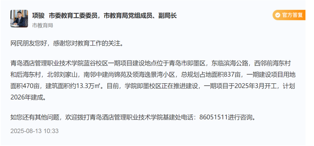 近日,青岛市委教育工委委员,市教育局党组成员、副局长项骏,针对此前做客“民生在线”直播间,与网民进行在线交流未能及时答复的问题完成线下二答。