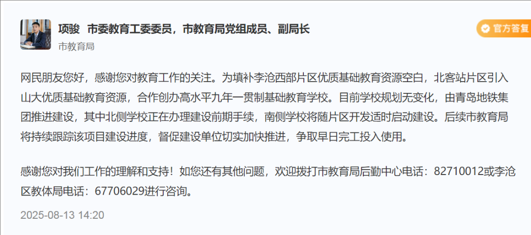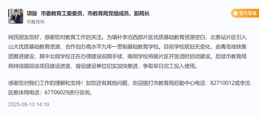 为填补李沧西部片区优质基础教育资源空白,北客站片区引入山大优质基础教育资源,合作创办高水平九年一贯制基础教育学校。目前学校规划无变化,由青岛地铁集团推进建设,其中北侧学校正在办理建设前期手续,南侧学校将随片区开发适时启动建设。后续市教育局将持续跟踪该项目建设进度,督促建设单位切实加快推进,争取早日完工投入使用。
