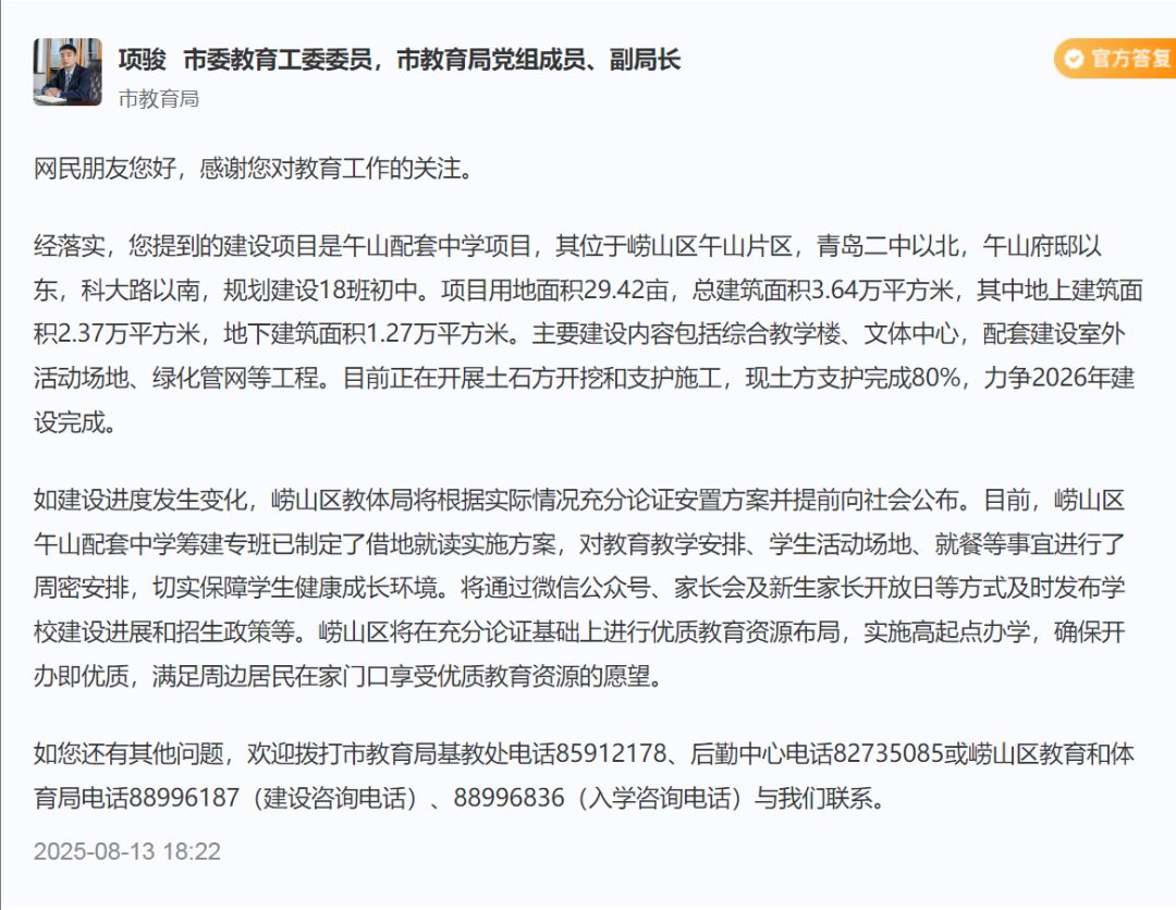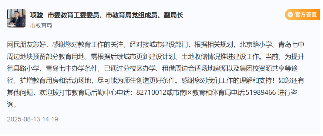 教育局最新回应!山东大学附属九年一贯制学校;北京路小学、青岛七中扩建;午山配套中学建设等问题