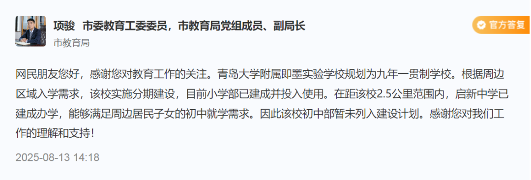 当前位置: 首页 资讯活动 教育局最新回应!山东大学附属九年一贯制学校;北京路小学、青岛七中扩建;午山配套中学建设等问题