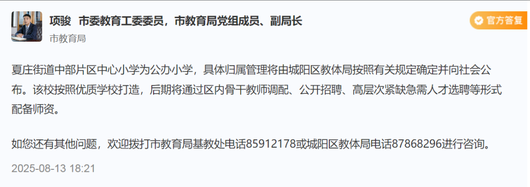 夏庄街道中部片区中心小学为公办小学,具体归属管理将由城阳区教体局按照有关规定确定并向社会公布。该校按照优质学校打造,后期将通过区内骨干教师调配、公开招聘、高层次紧缺急需人才选聘等形式配备师资。