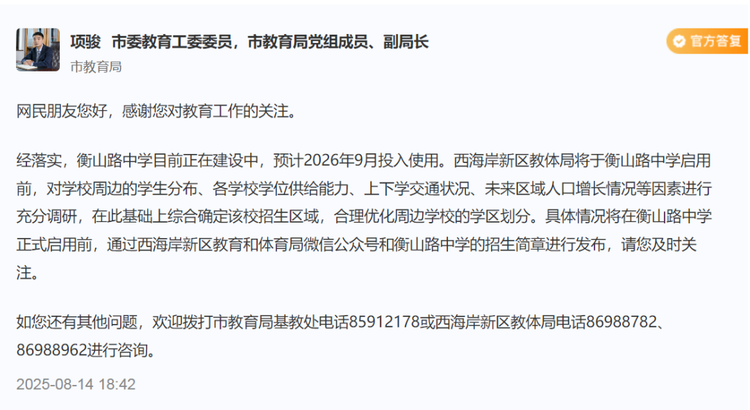 经落实,衡山路中学目前正在建设中,预计2026年9月投入使用。西海岸新区教体局将于衡山路中学启用前,对学校周边的学生分布、各学校学位供给能力、上下学交通状况、未来区域人口增长情况等因素进行充分调研,在此基础上综合确定该校招生区域,合理优化周边学校的学区划分。具体情况将在衡山路中学正式启用前,通过西海岸新区教育和体育局微信公众号和衡山路中学的招生简章进行发布,请您及时关注。