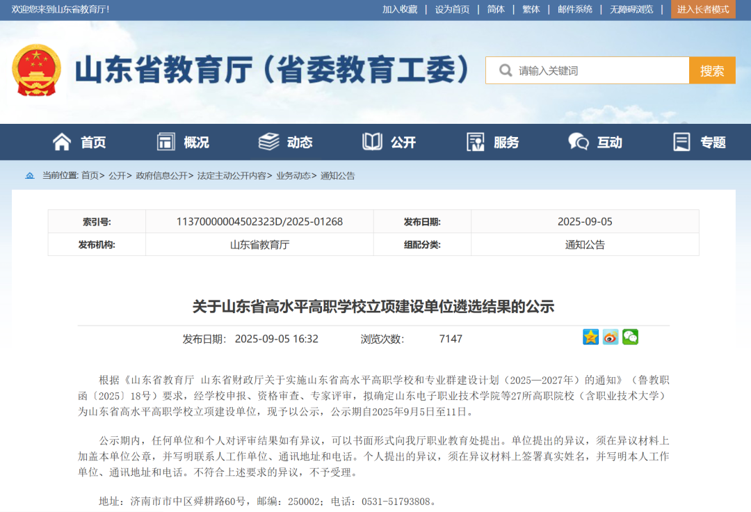 根据《山东省教育厅 山东省财政厅关于实施山东省高水平高职学校和专业群建设计划(2025—2027年)的通知》(鲁教职函〔2025〕18号)要求,经学校申报、资格审查、专家评审,拟确定山东电子职业技术学院等27所高职院校(含职业技术大学)为山东省高水平高职学校立项建设单位,现予以公示,公示期自2025年9月5日至11日。