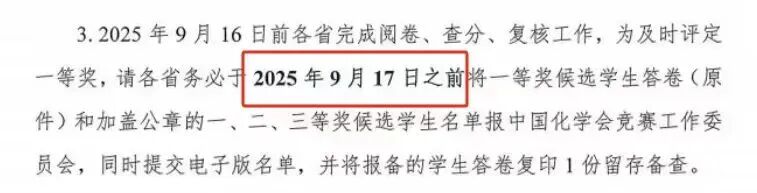 根据《第39届中国化学奥林匹克(初赛)通知》, 需在2025年9月17日之前将一等奖候选学生答卷(原件)和加盖公章的一、二、三等奖候选学生名单报中国化学会竞赛工作委员会。