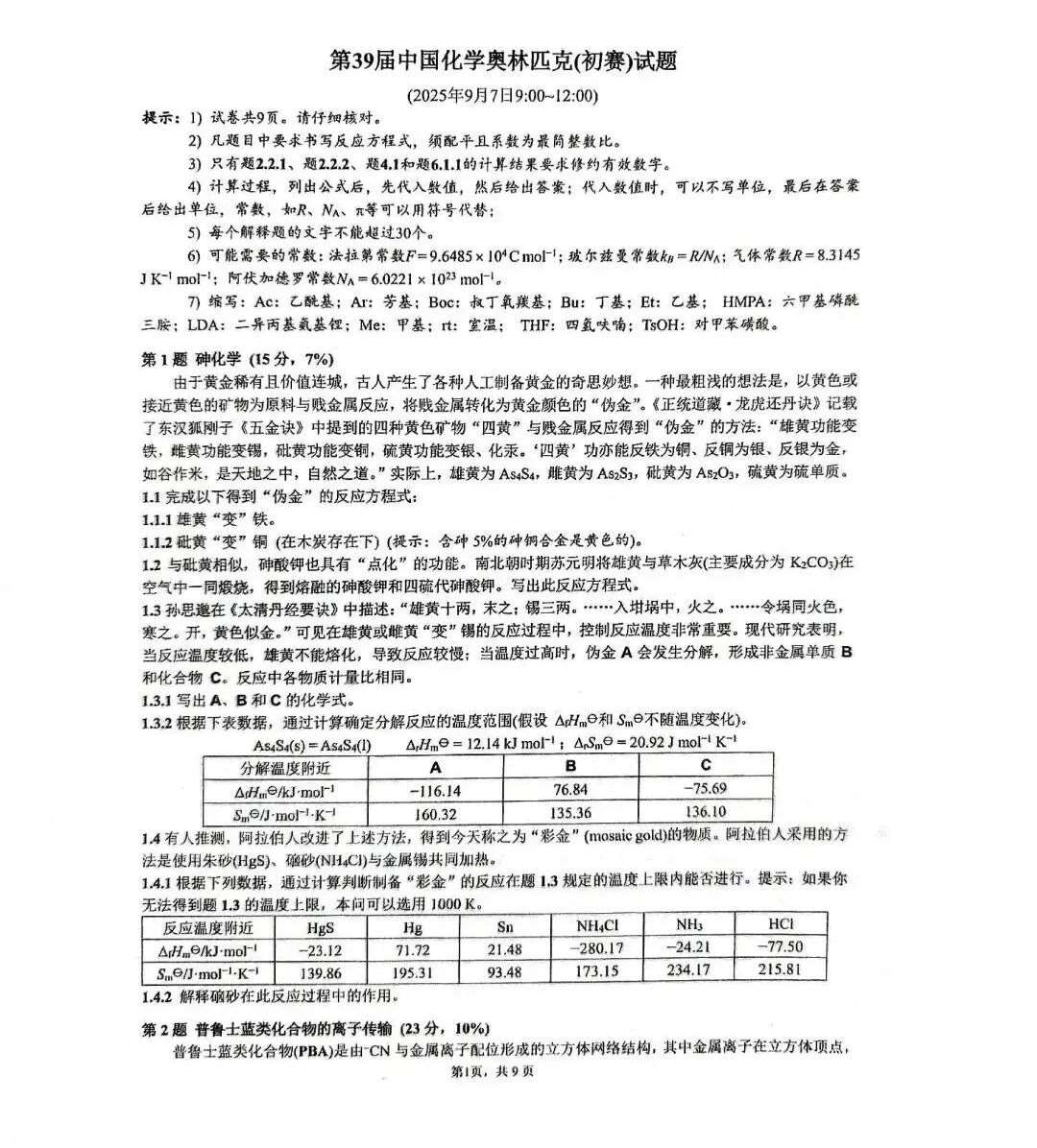 (图片来源:第39届中国化学奥林匹克(初赛)通知)
