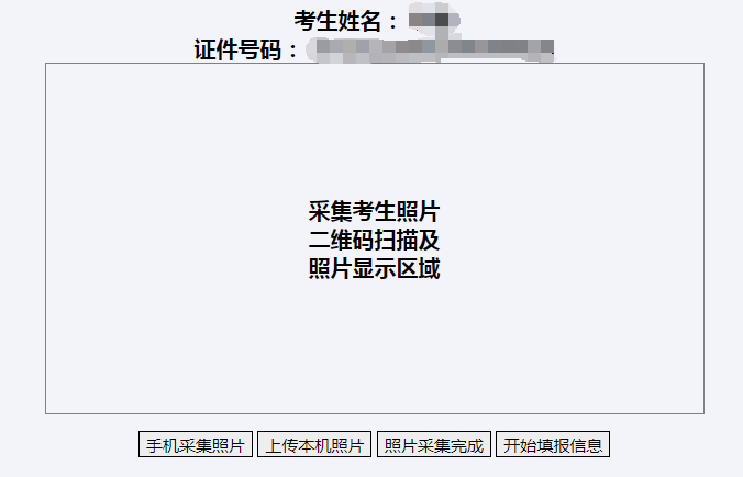 2.使用手机采集照片(包括手机拍照、上传手机已有照片)请点击“手机采集照片”,点击后系统将生成照片采集二维码。打开手机微信、浏览器或支付宝等APP,使用扫一扫功能、扫描下方二维码,依照提示拍照或上传手机已有照片。