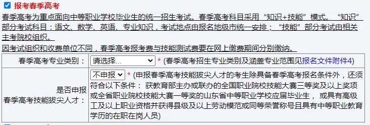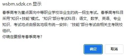 勾选上图“春季高考”、点击“选择春、夏季高考后开始填报信息”按钮,系统再次提示并请考生确认是否报考春季高考,如下图: