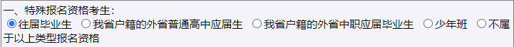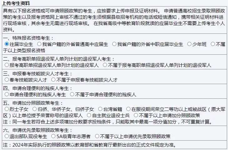 具有以下报名资格或可申请照顾政策的考生,应按要求上传申报及证明材料;审核通过的考生不需要再到现场审核,审核不通过的需要根据县级招考机构的电话或短信到现场审核。在我省高级中等教育阶段就读的应届毕业生不需要上传个人资料。