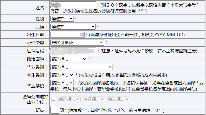 班级:填写毕业学校的班级,其他可选0(如报名区县公告没有对复读生的班级有要求,则统一写0)