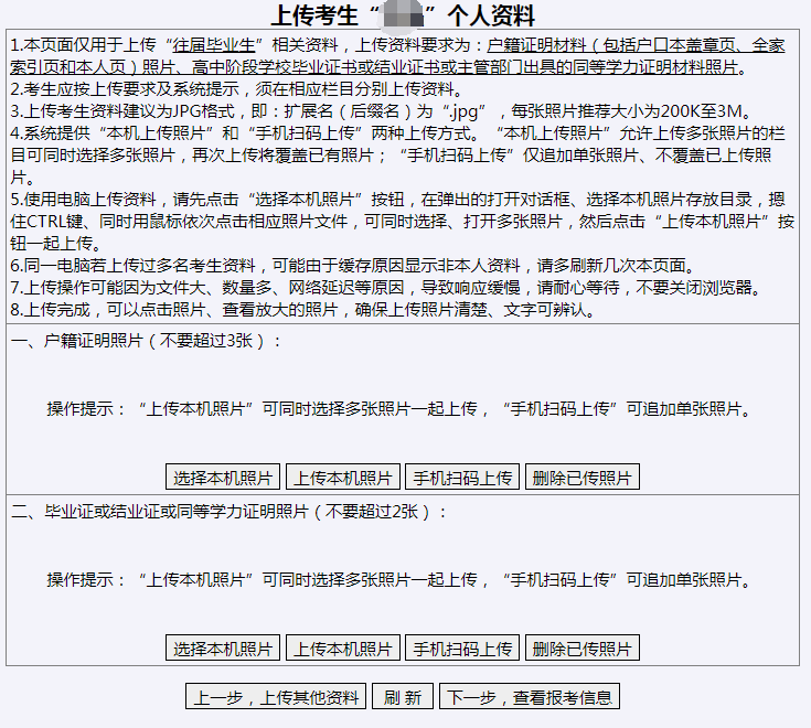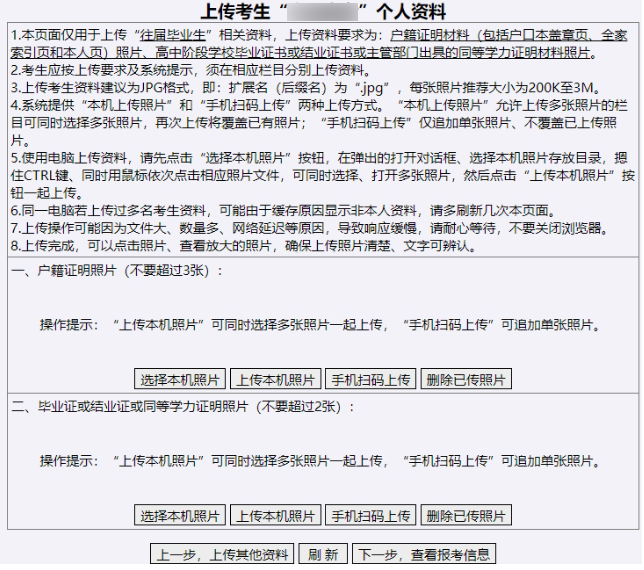 往届毕业生(复读生):需要上传户口本的(盖章页、索引页、考生本人页)和高中毕业证,未拿到高中毕业证的可以使用结业证或同等学力证明。