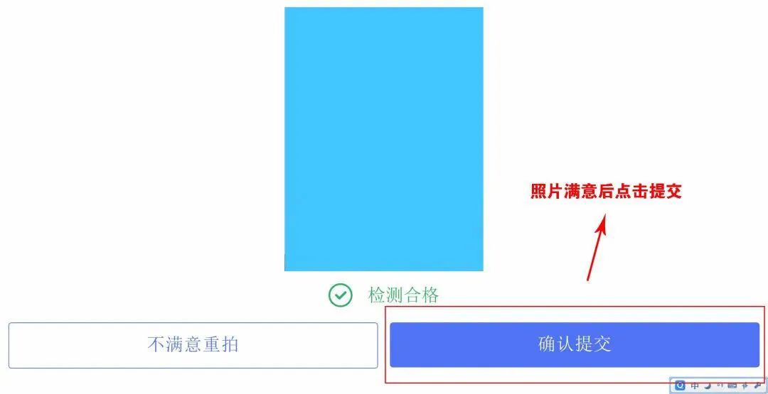 4.请耐心等待照片上传、检测和处理。不合格照片会提示考生重新拍照或上传,合格照片系统会自动将照片背景处理为浅蓝底色。若对照片满意请点击“确认提交”完成采集工作,不满意可以点击“不满意重拍”重新拍照或上传考生照片。