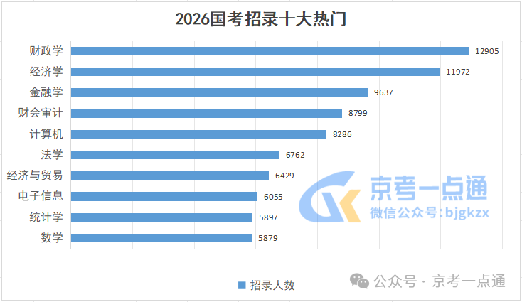 据中央机关及其直属机构2026年度考试录用公务员招考简章内容分析,几乎所有职位都有专业要求,其中,财政学类以12905的可报考岗位总人数位居热门专业榜首,经济学类、金融学类紧随其后。