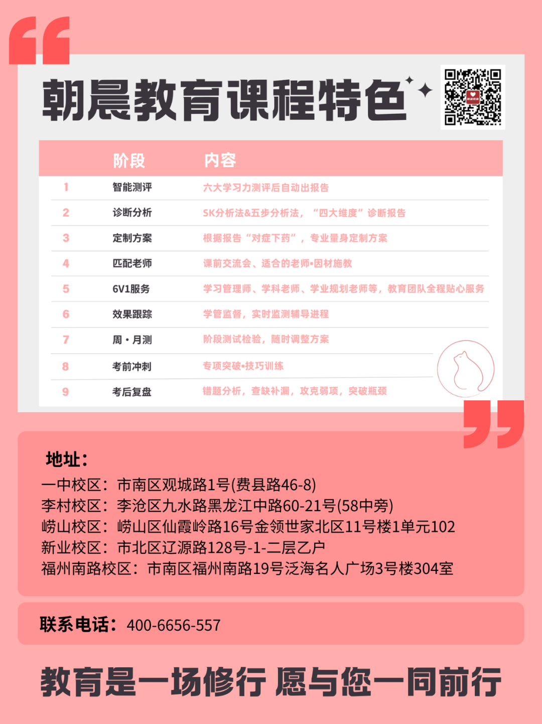朝晨教育,2012 年由盛乾集团投资成立,旗下有科技、教育等五家公司,教育板块是青岛教培白名单机构之一。它专注全年龄段培训,提供 1 对 1 专属订制、VIP 精品、线上线下大课等形式,K12 服务涵盖文化课、艺考、军考、升学辅导等诸多项目,还涉及大学生、成人、老人培训及关系学院,同时配套脑数据云科学、心理咨询、职场服务等多元项目。