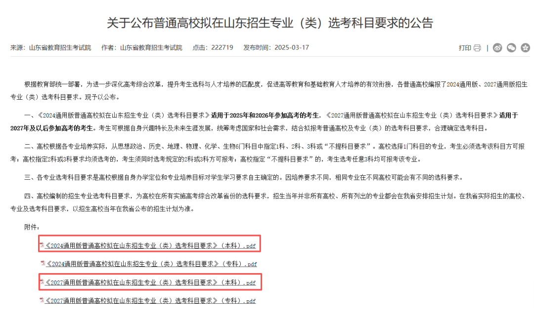 但是需要注意,《2024通用版普通高校拟在山东招生专业(类)选考科目要求》适用于2025年和2026年参加高考的考生,《2027通用版普通高校拟在山东招生专业(类)选考科目要求》适用于2027年及以后参加高考的考生。