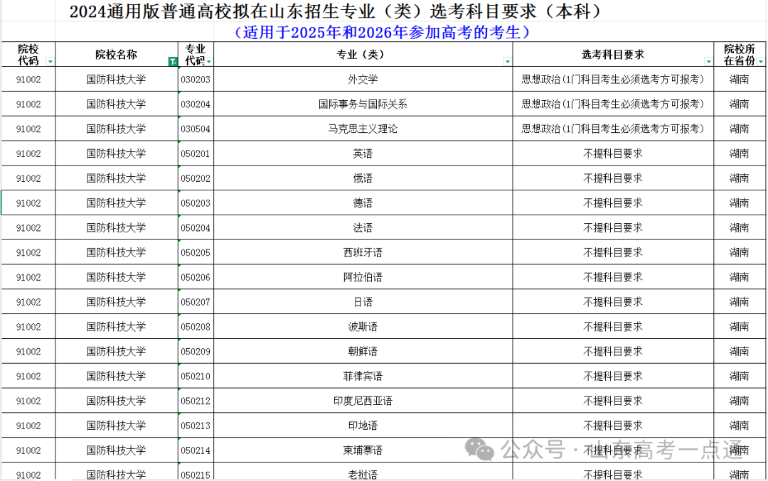 将文件下载下来后,筛选出国防科技大学的《2024通用版普通高校拟在山东招生专业(类)选考科目要求》和《2027通用版普通高校拟在山东招生专业(类)选考科目要求》即可。检索如下: