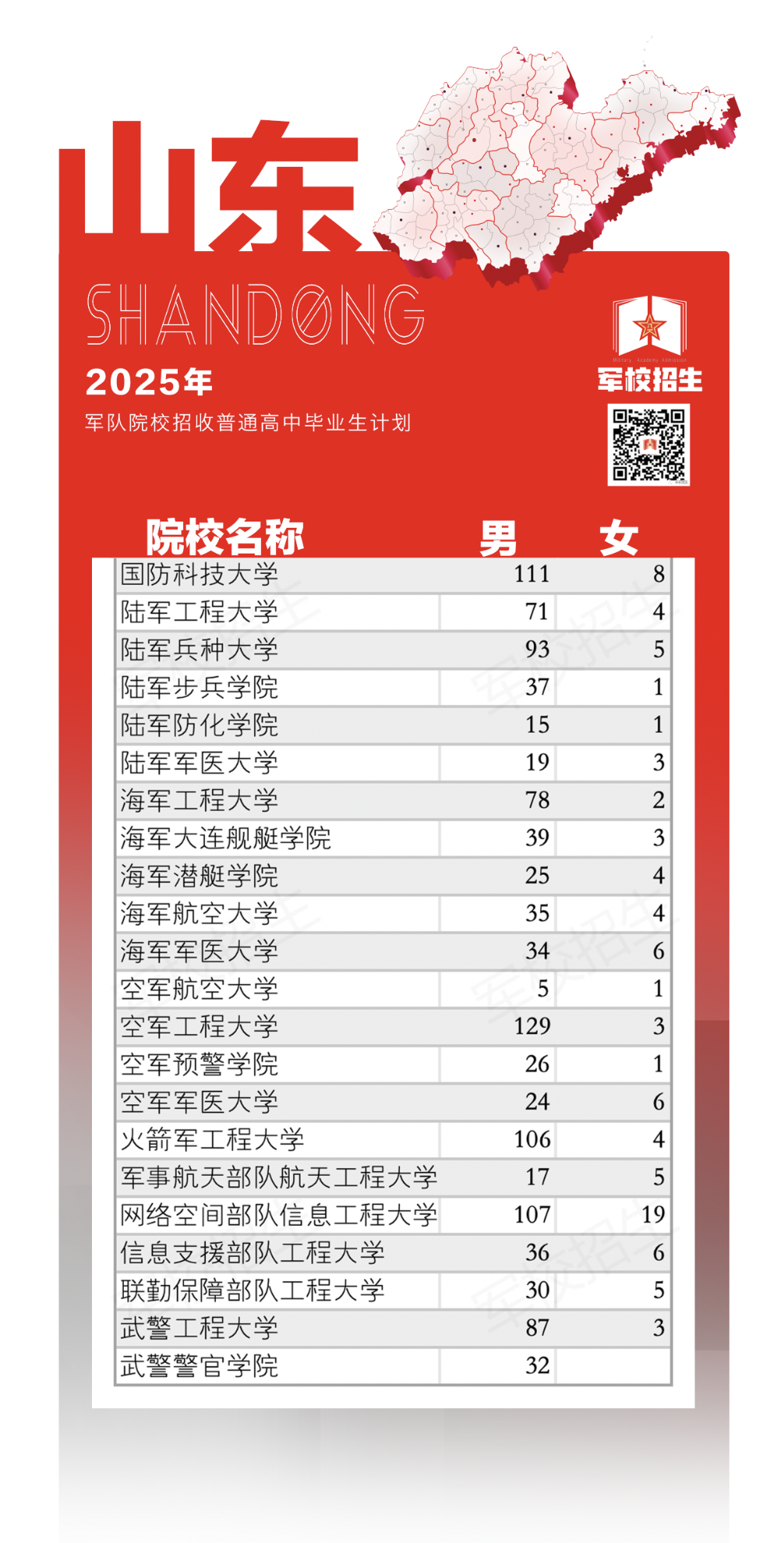 2025年,全军22所军校在山东省招收普通高中毕业生。其中包括军委直属院校1所(国防科技大学),军兵种院校19所(陆军工程大学、陆军兵种大学、陆军步兵学院、陆军防化学院、陆军军医大学、海军工程大学、海军大连舰艇学院、海军潜艇学院、海军航空大学、海军军医大学、空军航空大学、空军工程大学、空军预警学院、空军军医大学、火箭军工程大学、军事航天部队航天工程大学、网络空间部队信息工程大学、信息支援部队工程大学、联勤保障部队工程大学),武警部队院校2所(武警工程大学、武警警官学院)。各学校在山东的招生计划如下: