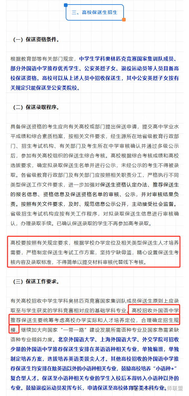 在今年11月教育部印发的《关于做好2026年普通高等学校部分特殊类型招生工作的通知》中,对外语类推荐政策提出了“刚性”要求:严格要求所有高校“不得简单以提交材料审核代替线下考核”,即强制线下考核。对计划走外语类推荐生升学途径的考生来说,这一“风向标”要提前了解: